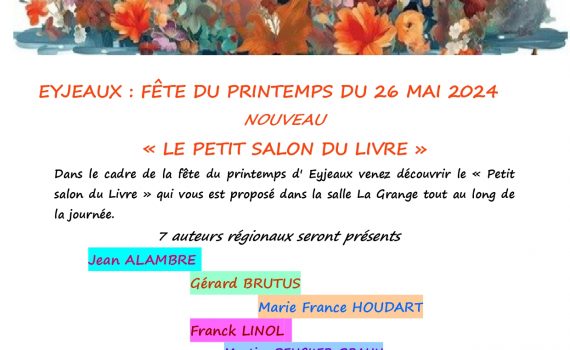 Eyjeaux fête le printemps ! Des artisans, des commerçants, des animations, et la première édition du Salon du Livre. Une belle journée dominicale se profile ! Franck Linol sera présent l’après-midi.